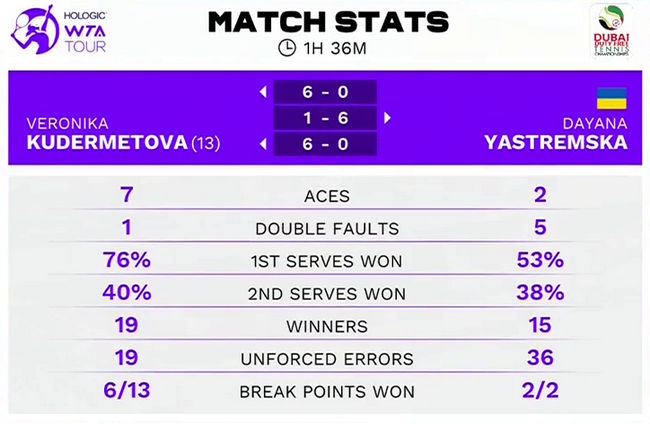 Для Ястремской это было пятое выступление в основной сетке соревнований в Дубае и третий раз она уступила в первом круге. Свой лучший результат Даяна показала два года назад, когда с квалификации дошла до четвертьфинала.