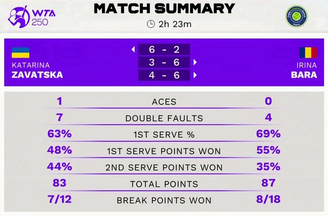 Катарина Завацкая (Украина, Q) — Ирина Бара (Румыния) 6:2, 3:6, 4:6