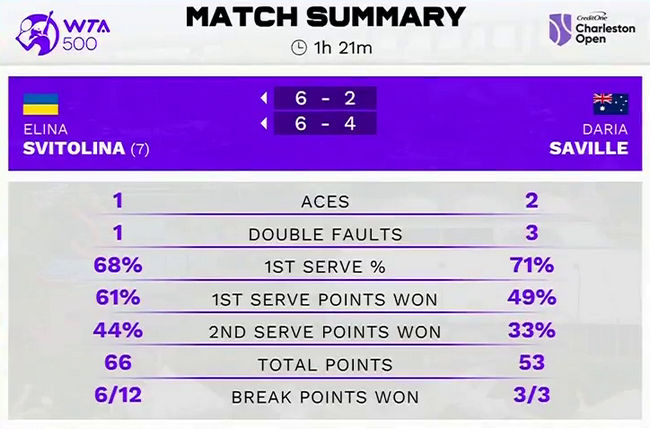 Элина Свитолина и Дарья Сэвилл сыграли друг с другом 11-й раз. Украинка праздновала восьмую победу и при этом обыграла свою соперницу седьмой раз подряд. Свитолина три раза проиграла свою подачу и сделала шесть брейков. Поединок продолжался 80 минут.