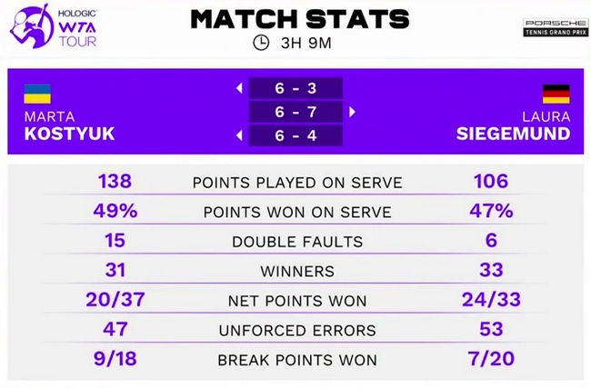Марта Костюк (Украина) — Лаура Зигемунд (Германия, WC) 6:3, 6:7(4), 6:4