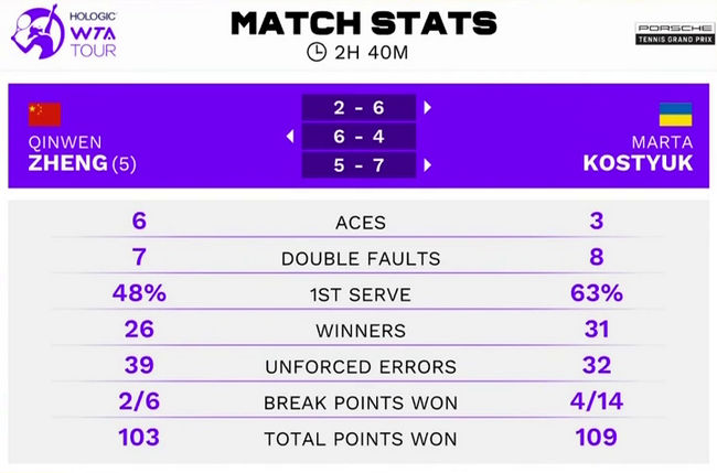 Костюк праздновала пятую в карьере победу над представительницей топ-10 рейтинга и вторую в текущем сезоне. Полтора месяца назад Марта была сильнее Джессики Пегулы в полуфинале турнира WTA 500 в Сан-Диего.