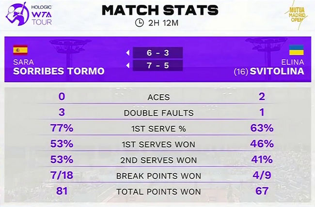 Во втором сете Свитолина вела со счётом 5:3 и не смогла подать на сет в десятом гейме. Украинка четвёртый раз подряд проиграла в своём первом матче в Мадриде: в 2019, 2022 и 2023 годах она стартовала с первого раунда.