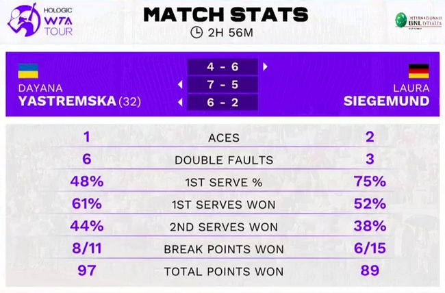Даяна Ястремская выиграла свой стартовый матч в одиночном разряде турнира WTA 1000 в Италии