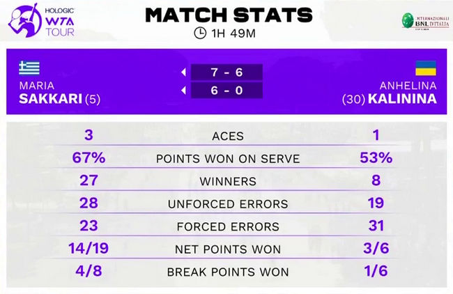 Теннисистки провели третью очную встречу, в которой украинка потерпела второе поражение: в 2022 году Ангелина обыграла гречанку на травяном турнире WTA 500 в Истборне, а в предыдущем сезоне Саккари взяла реванш на хардовом турнире WTA 1000 в Индиан-Уэллс.