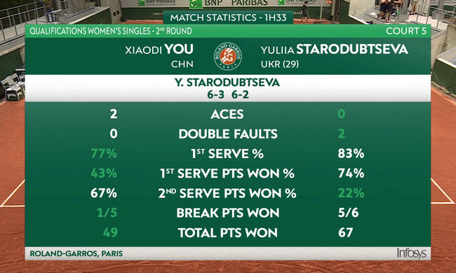 Юлия Стародубцева (Украина, 29) — Ю Сяоди (Китай) 6:3, 6:2