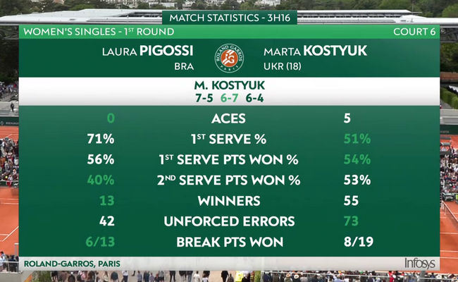 Марта Костюк (Украина, 18) — Лаура Пигосси (Бразилия, Q) 7:5, 6:7(4), 6:4