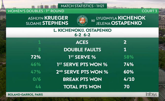 Людмила Киченок/Елена Остапенко (Украина/Латвия, 6) — Эшлин Крюгер/Слоан Стивенс (США) 6:2, 6:2