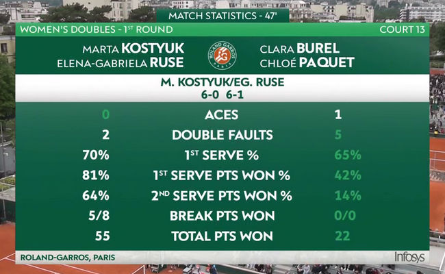 Марта Костюк/Елена-Габриэла Русе (Украина/Румыния) — Клара Бюрель/Клоэ Паке (Франция, WC) 6:0, 6:1