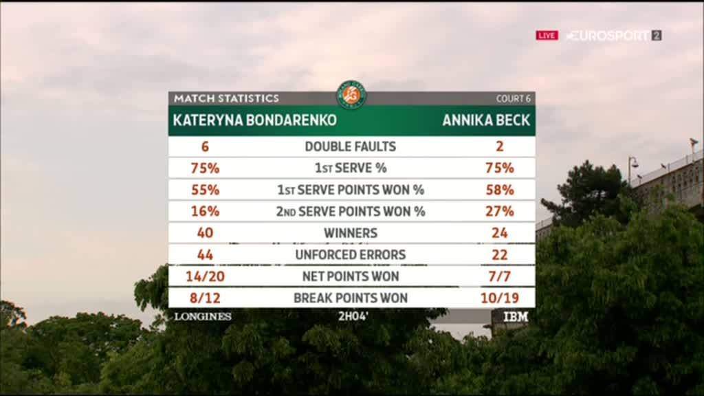Немка уверенно действует на подаче (6-5) и получает два матчбола в гейме Бондаренко. Первый Бек проигрывает, допустив ошибку по длине. На втором матчболе идет длительный обмен ударами, никто не решается атаковать. Анника исполняет укороченный, Катерина на него отвечает и получает «свечку» от Бек. Мяч попадает в корт и приносит победу представительнице Германии. Поединок продолжался чуть более двух часов.