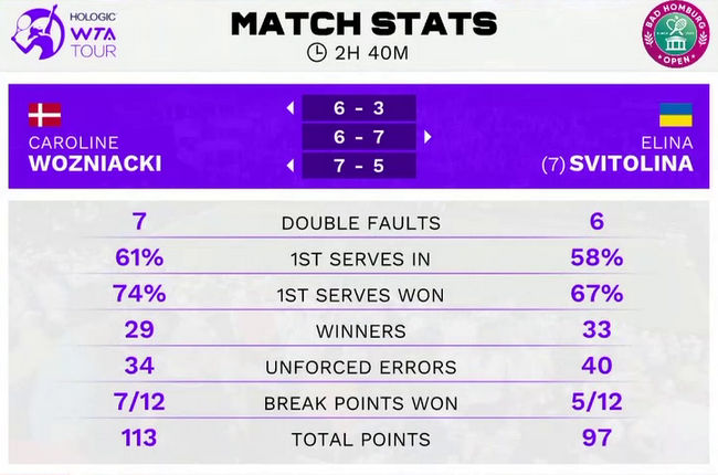 После возобновления встречи, Свитолина взяла гейм на своей подаче (3-1), после чего проиграла четыре гейма подряд. Украинка остановила успешную серию датчанки, не дав ей подать на матч в девятом гейме и затем сравняла счет, однако два последующих гейма остались за Возняцки.