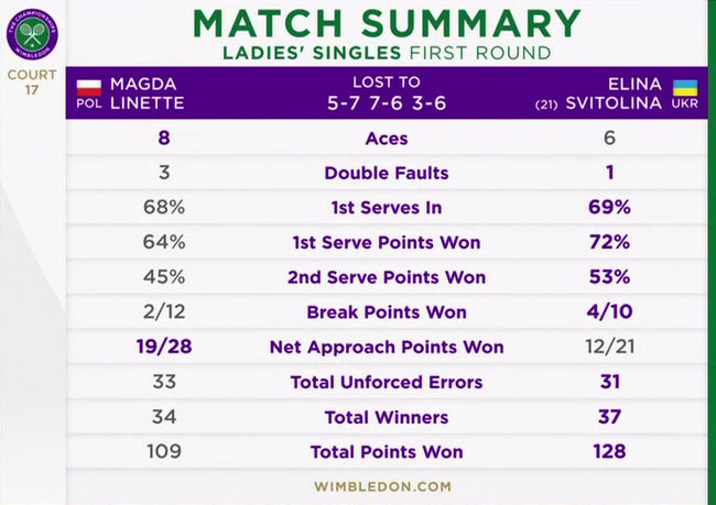 Элина Свитолина взяла реванш у Магды Линетт за поражение во втором круге Уимблдона-2021 и увеличила свое преимущество в очном противостоянии с полькой: 3-1.