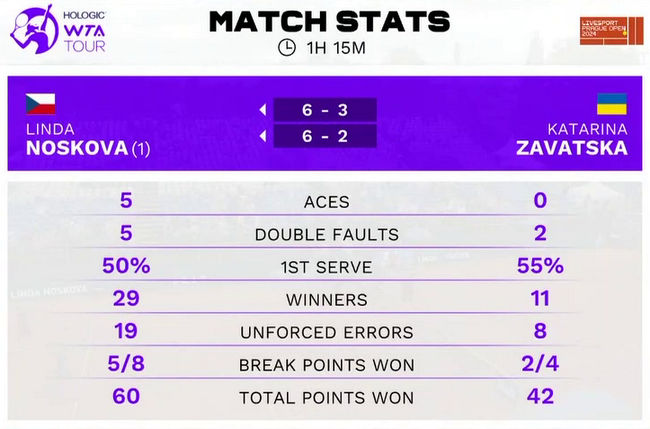 Напомним, что Линда Носкова в прошлом году дошла до финала на турнире в Праге. Следующая соперница чешки определится в матче Анастасия Соболева (Украина, Q) — Ева Лис (Германия).
