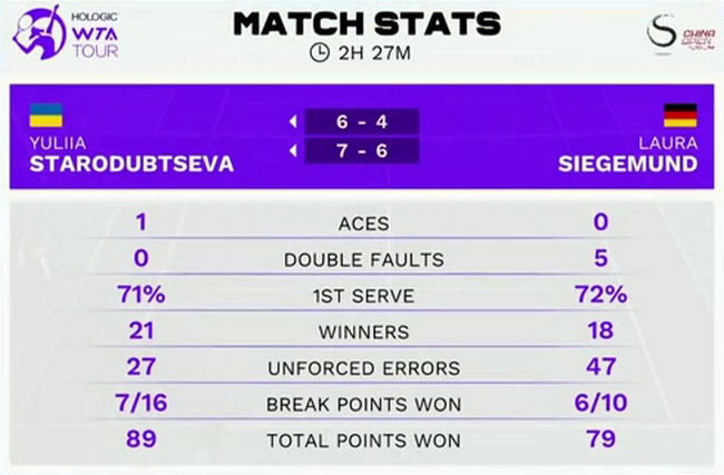 Юлия Стародубцева затратила на свою победу 2,5 часа игрового времени. В первом сете украинка отыгралась со счета 2:4, а во второй партии дважды не подала на матч (в десятом и двенадцатом геймах).
