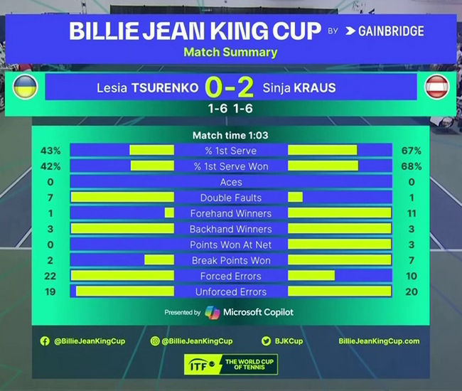 После этой победы, Австрия вышла вперед в противостоянии с Украиной — 2:1. В следующей встрече сыграют Катарина Завацкая и Тамира Пашек. Напомним, что для общей победы в этом поединке, одна из сборных должна набрать три очка.
