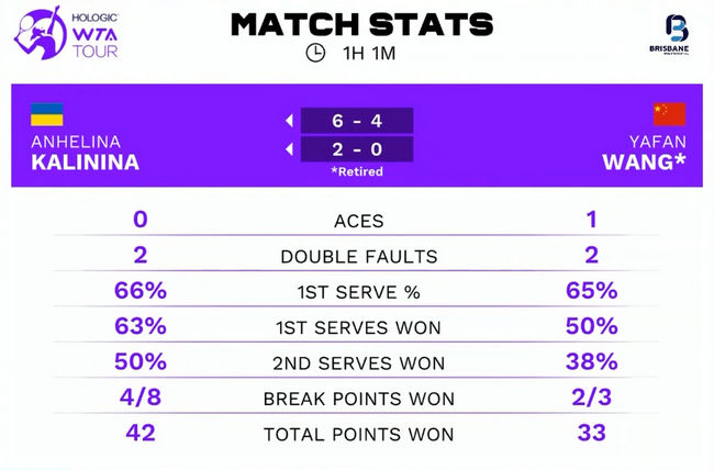 После окончания первого сета, Ван Яфань обратилась за помощью врача из-за проблем с левым запястьем и после двух сыгранных геймов второй партии, приняла решение досрочно завершить поединок.