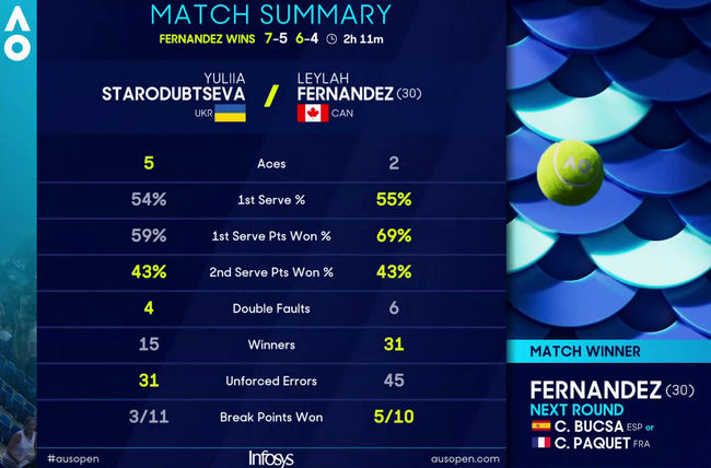 Поединок продолжался 2 часа 11 минут. Украинка пять раз подала навылет, допустила четыре двойные ошибки (у Фернандес — два эйса и шесть двойных), сделала три брейка и проиграла пять геймов на своей подаче.