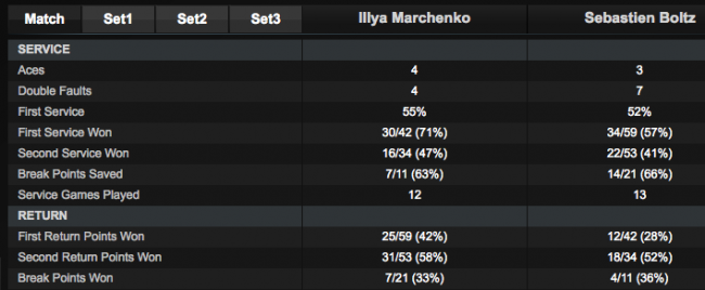 За 2 часа 07 минут Марченко сломил сопротивление 21-летнего французского «лаки-лузера» Себастьена Больца, который занимает скромное 501-е место в мировом рейтинге. Поединок завершился со счетом 3-6 6-4 6-0 в пользу украинца. Илья записал на свой счет четыре подачи навылет, допустил столько же двойных ошибок и сделал семь брейков на подаче соперника.