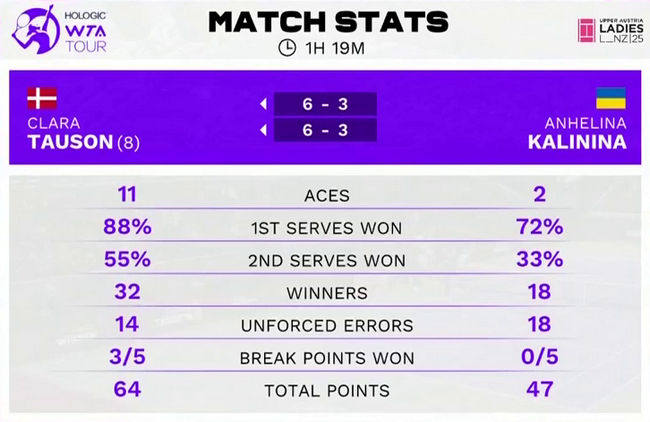 Украинская теннисистка потерпела второе поражение за четыре сыгранных матча против Таусон. Их предыдущая встреча состоялась в концовке сезона 2022 года в финале турнира WTA 125 в Лиможе, где была сильнее Калинина.