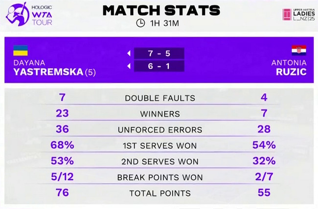 Даяна Ястремская (Украина, 5) — Антония Ружич (Хорватия, Q) 7:5, 6:1