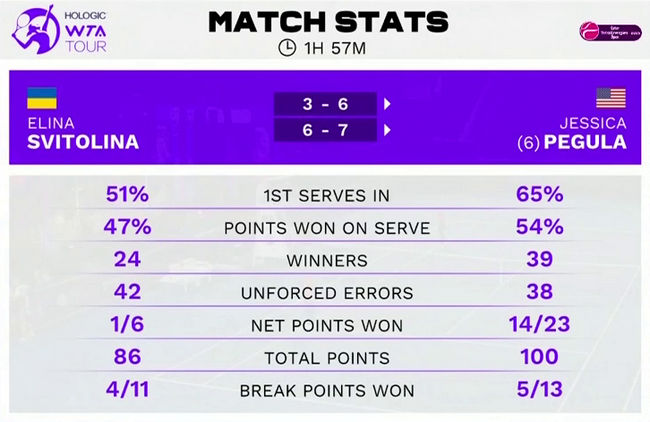 Украинская теннисистка потерпела пятое поражение в семи сыгранных матчах против Пегулы. Предыдущие четыре также были на хардовом покрытии. Во втором сете сегодняшней встречи Свитолина отыграла преимущество соперницы, которая была впереди 4:2, на на тай-брейке не сумела перевести матч в решающий сет.