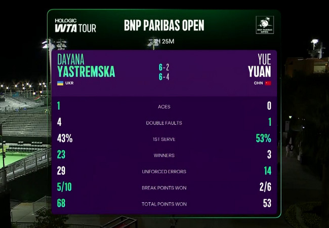 Даяна Ястремская третий раз выиграла в первом круге турнира в Индиан-Уэллс. Ей это также удавалось в 2021 и 2023 годах.