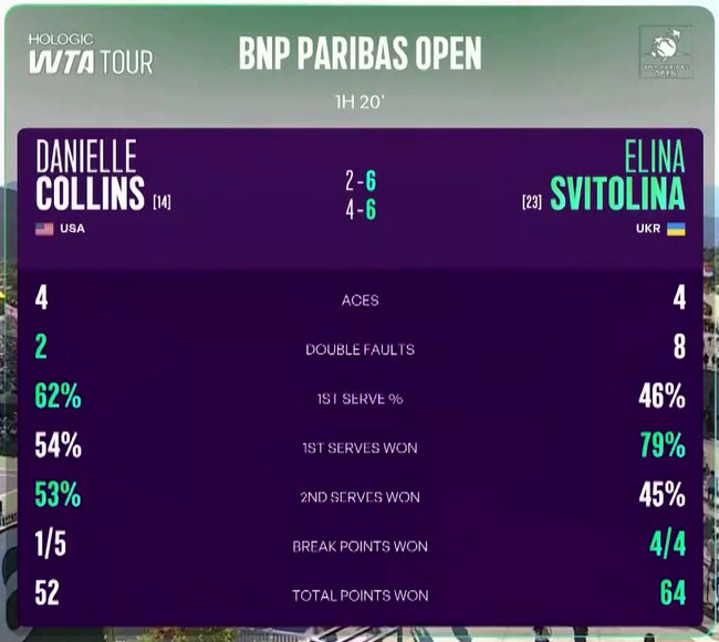 Украинская теннисистка одержала первую победу в трёх сыгранных матчах против Коллинс, которой уступила в 2020 году в Брисбене и в 2023 году в Монреале. Также Свитолина впервые с 2021 года вышла в четвёртый круг BNP Paribas Open.
