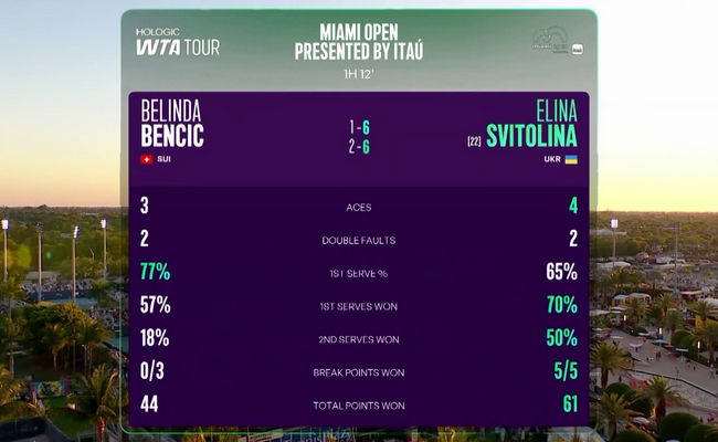 Свитолина выиграла третий из пяти сыгранных матчей против Бенчич и впервые с 2021 года вышла в третий круг соревнований в Майами. Тогда четыре года назад украинка показала здесь свой лучший результат, дойдя до полуфинала.