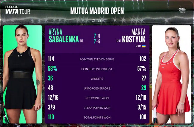 Во втором сете Костюк повела 2:0, но Соболенко сразу сравняла счет. Дальше теннисистки вновь удерживали геймы на своих подачах, практически до тай-брейка, пока Соболенко не взяла подачу Марты в 11-м гейме. Костюк не дала сопернице подать на матч, сделав обратный брейк и отыграв при этом один матчбол.