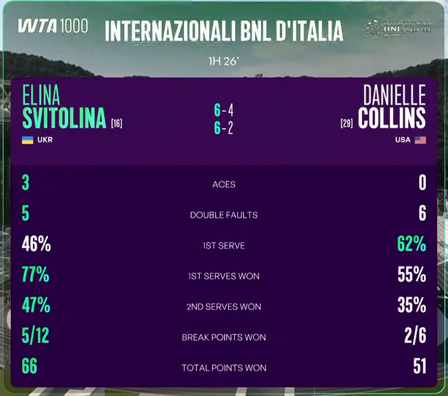 Элина Свитолина сравняла счет в очном противостоянии с Даниэль Коллинс (2-2), обыграв ее второй раз в этом году. Украинская теннисистка три раза подала навылет, допустила пять двойных ошибок, проиграла два гейма на своей подаче и сделала пять брейков. Поединок продолжался 86 минут.