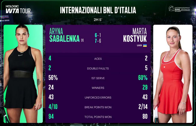 Украинка четвертый раз сыграла против Соболенко и боролась за свою первую победу в матчах против нее. Напомним, что две недели назад Марта уступила ей в четвертьфинале турнира WTA 1000 в Мадриде.