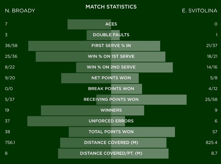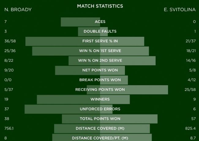 Два брейкпоинта из семи реализовала в стартовом сете украинка, не дав сопернице завязать борьбу на своей подаче. Вторую партию Свитолина также начала с брейка, а затем выиграла и первый же матчбол в этой встрече на подаче Броди.