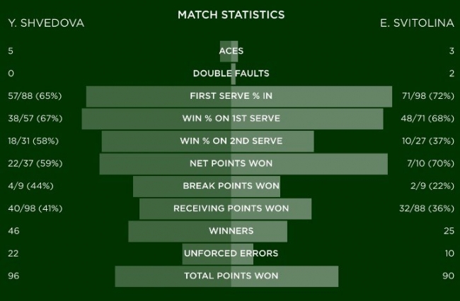 Элина завладела инициативой в начале решающего сета (2-0) и не дала сопернице сделать обратный брейк в четвертом гейме. Шведовой удается сравнять счет со второй попытки: 4-4. Был у Свитолиной скрытый матчбол, но представительница Казахстана свой гейм защищает, а потом делает второй брейк подряд для победы в матче.