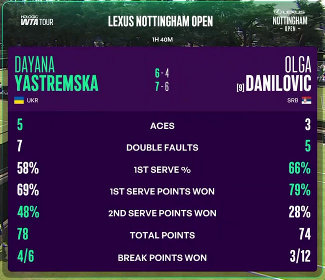 Ястремская третий раз играет в Ноттингеме и впервые выиграла матч в основной сетке. Ее следующая соперница определится в противостоянии Антония Ружич (Хорватия, Q) — Лучия Брондзетти (Италия).