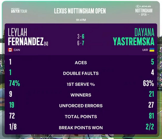 Украинская теннисистка одержала первую победу в трех сыгранных матчах против Фернандес, которой проиграла в 2021 году на Олимпиаде в Токио и в 2023 году на турнире WTA 1000 в Дохе.