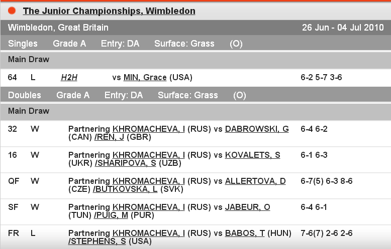 • 4 июля 2010 года: Элина Свитолина — финалистка юниорского Уимблдона в паре.