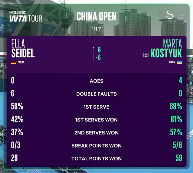 Украинская теннисистка провела на корте один час игрового времени. По ходу встречи Костюк выиграла пять геймов на подаче Зайдель и отыграла все три брейк-поинта.