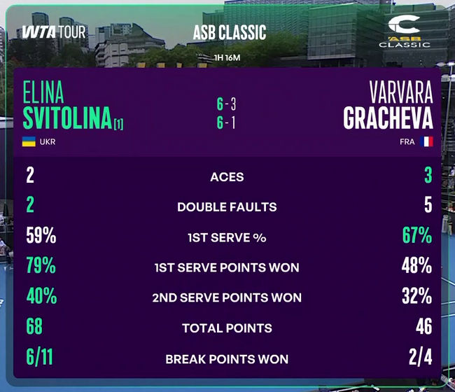 Свитолина затратила на свою победу 76 минут игрового времени. Она два раза подала навылет, допустила две двойные ошибки (у Грачевой — три эйса и пять двойных), проиграла два гейма на своей подаче и сделала шесть брейков.