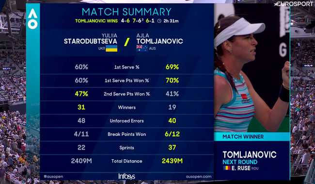 Юлия Стародубцева (Украина, Q) — Айла Томлянович (Австралия) 6:4, 6:7(3), 1:6