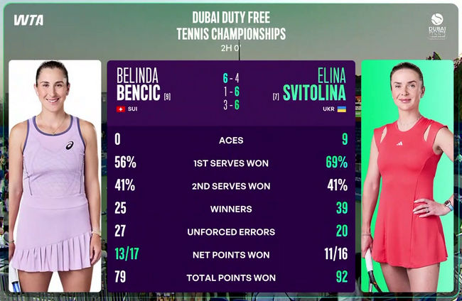 Элина в одиннадцатый раз участвует в соревнованиях в ОАЭ и в пятый раз сыграет в четвертьфинале. Последний раз она добиралась до этой стадии в 2019 году. Тогда она дошла до полуфинала, в котором проиграла именно Бенчич. Также напомним, что украинка выигрывала здесь титул в 2017 и 2018 годах.