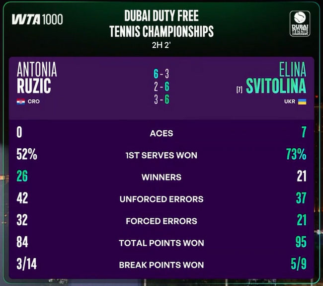 Дубай. Свитолина за два часа победила "лаки лузера" Ружич на пути в полуфинал