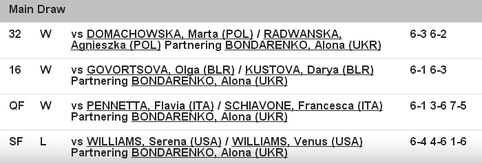 Алёна и Катерина Бондаренко дошли до 1/2 финала на Олимпиаде в Пекине. В борьбе за выход в финал наши теннисистки уступили только сестрам Уильямс (6-4 4-6 1-6). В борьбе за «бронзу» украинки потерпели поражение от китайской пары Зи/Чен 2-6 2-6.
