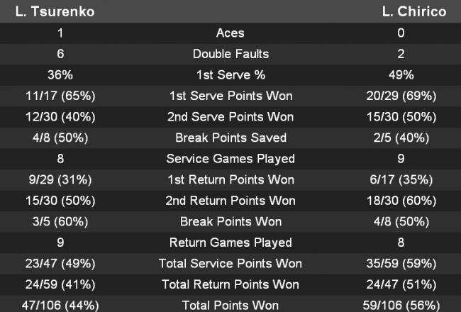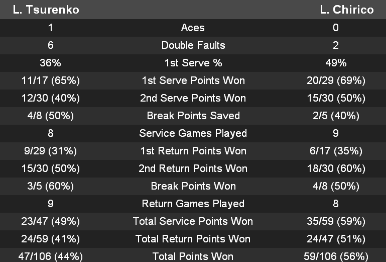 Украинка в каждой партии лидировала со счетом 3-1, но оба раза преимущество упускала. Если в первом сете Цуренко проиграла с 1-3 пять геймов подряд, то во втором сете смогла во второй раз взять гейм на подаче соперницы (4-2). Чирико сумела вновь выполнить обратный брейк и затем сравнять счет. После восьмого гейма Леся снялась с матча.