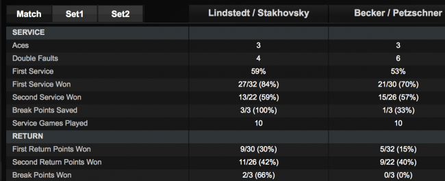 В финале украинско-шведский дуэт уверенно переиграл немецкую пару Бенджамин Беккер / Филипп Петцшнер: 6-4 6-3. Сергей и Роберт три раза подали навылет, допустили четыре двойные ошибки и сделали по одному брейку в каждом сете. Поединок продолжался 1 час 05 минут.