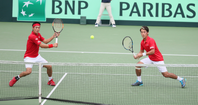 Кеи Нисикори и Юичи Сугита берут третье очко в парном матче против Сергея Стаховского и Артема Смирнова.