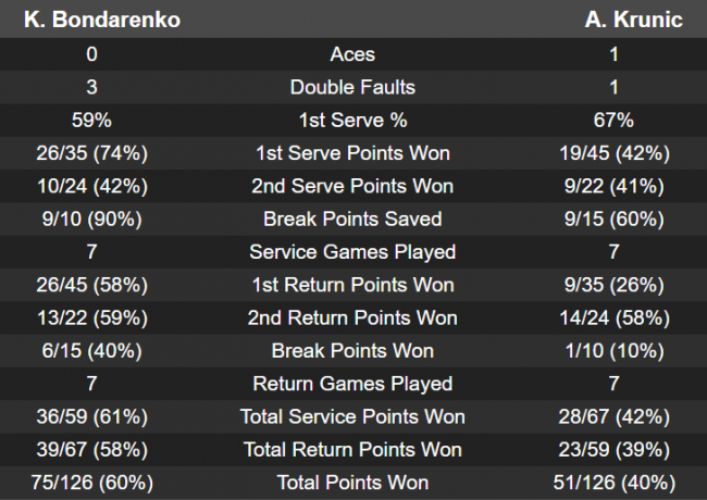 Из-за дождя матч был прерван при счете 4-0 в первой партии. Даже после длительной паузы расстановка сил на корте не изменилась — Катерина отдала Крунич только два гейма. Потенциальные соперницы Бондаренко в основной сетке: Анастасия Севастова (Латвия), Янина Викмайер (Бельгия), Олеся Первушина (Россия), Барбора Стрыцова (Чехия).