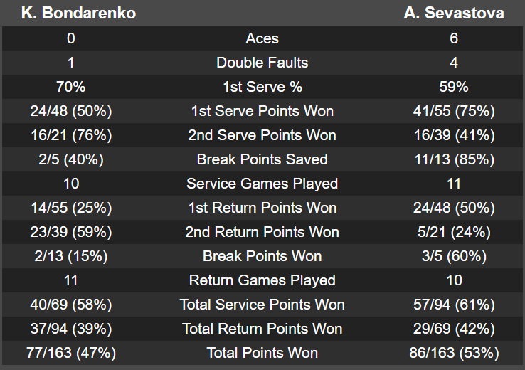 Катерина Бондаренко (Украина, Q) — Анастасия Севастова (Латвия) 6-7(3) 3-6