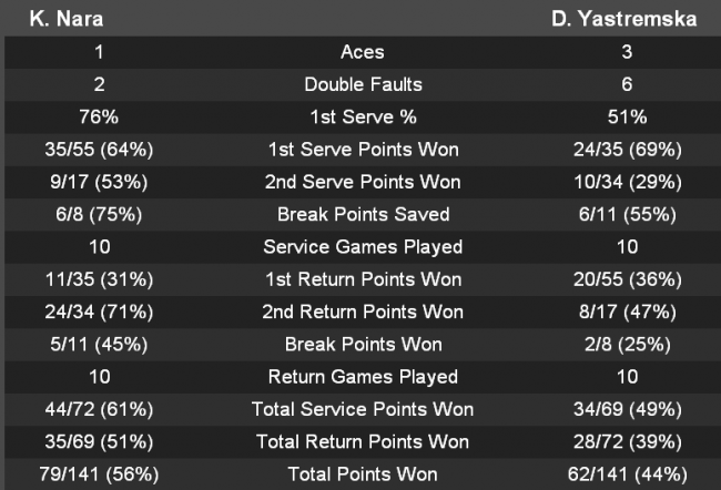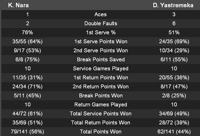 Ястремская проигрывала по ходу первого сета 2-5, но смогла навязать борьбу 80-й ракетке мира. Во второй партии японке со старта удалось сделать брейк и дальше свое преимущество Нара уже не отдала. Куруми не сумела подать на победу при счете 5-1 — Даяна уходит с матчбола и со второй попытки берет этот гейм. Но продлить матч надолго не удалось — соперница делает еще один брейк и выигрывает матч.