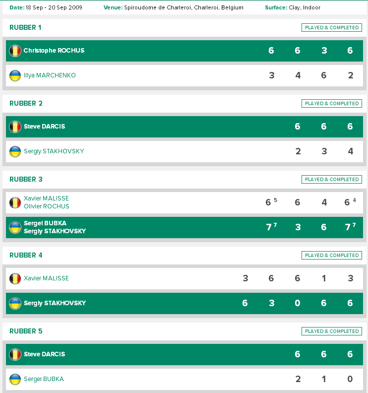 Первая попытка «сине-желтых» пробиться в элиту мужского командного турнира была близка к успеху. Наша сборная проигрывала 0-2 после стартового игрового дня, но победа в паре оставляла шансы навязать борьбу. Сергей Стаховский сумел перевести это противостояние в решающий раунд, одержав волевую победу в пяти сетах (отыгрался с 1-2). В последнем поединке Стив Дарсис отдал Сергею Бубке-младшему только три гейма.