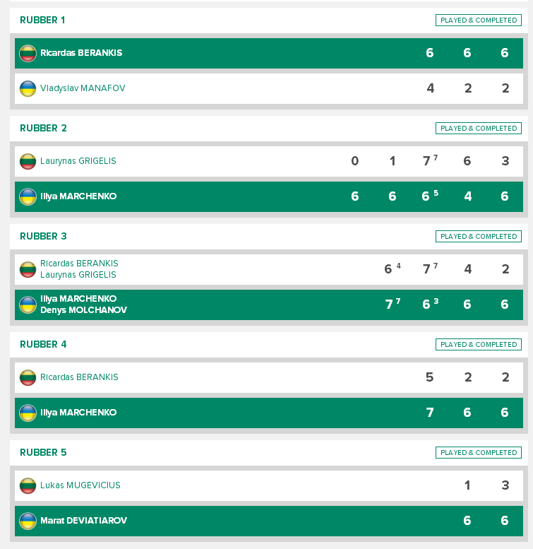 Илья Марченко впервые выступил в качестве лидера сборной и выиграл две одиночные встречи, а вместе с Денисом Молчановым — парную встречу. Дебютом на Кубке Дэвиса отметился Марат Девятьяров. Победа в противостоянии с литовцами позволила нашей команде начать новый сезон с четвертьфинала в Первой группе Евро-Африканской зоны.