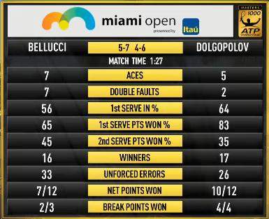 Сегодня, в матче третьего круга, Долгополов за 1 час 27 минут переиграл бразильского теннисиста Томаза Беллуччи: 7-5 6-4. Александр записал на свой счет пять подач навылет, два раза допустил двойную ошибку и реализовал все четыре заработанных брейк-пойнта. Отметим, что в первой партии Долгополов уступал 4-5 с брейком, и отыграл на подаче бразильца четыре сетбола.